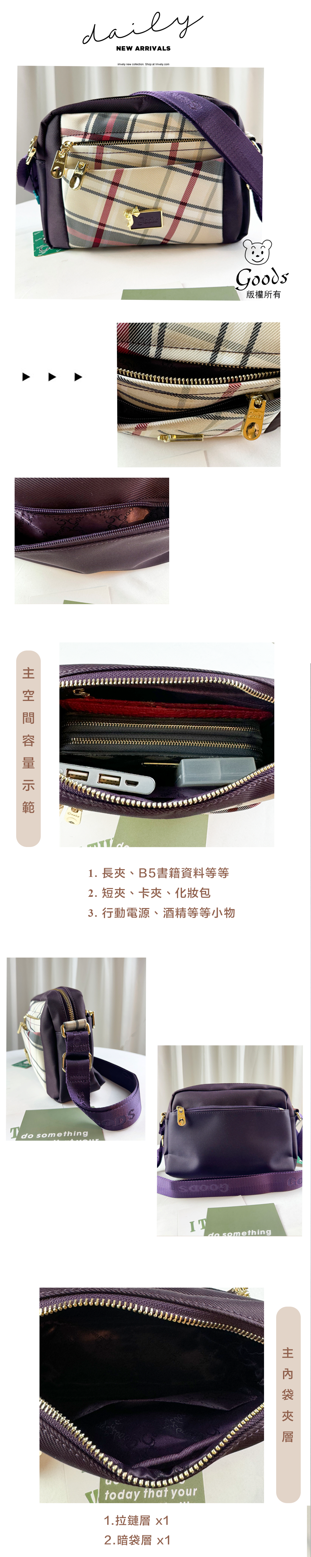 GOODS 紫格紋拼色防潑水肩背包 / 側背包 #2666