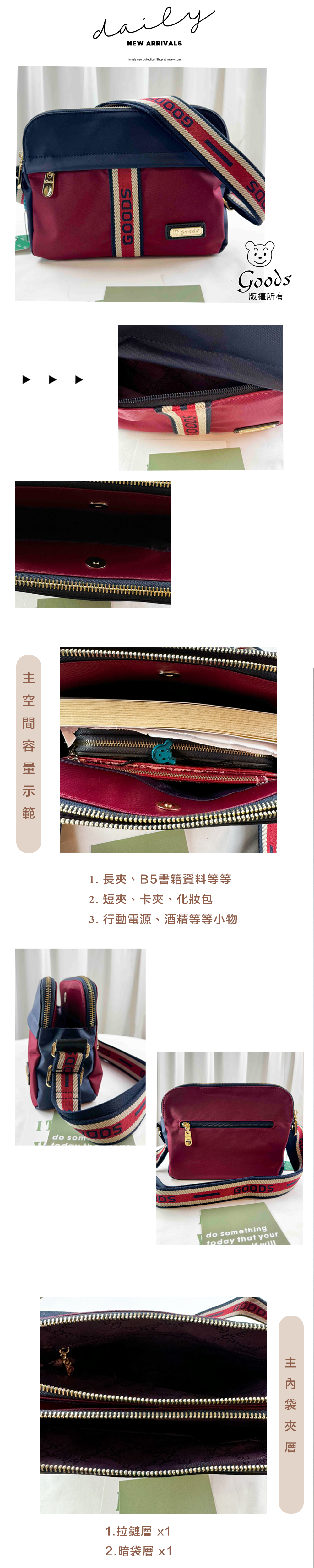 ●  規格:主空間x3  內拉鍊袋x1  暗格x1  前測拉鍊x1  後測拉鍊x1