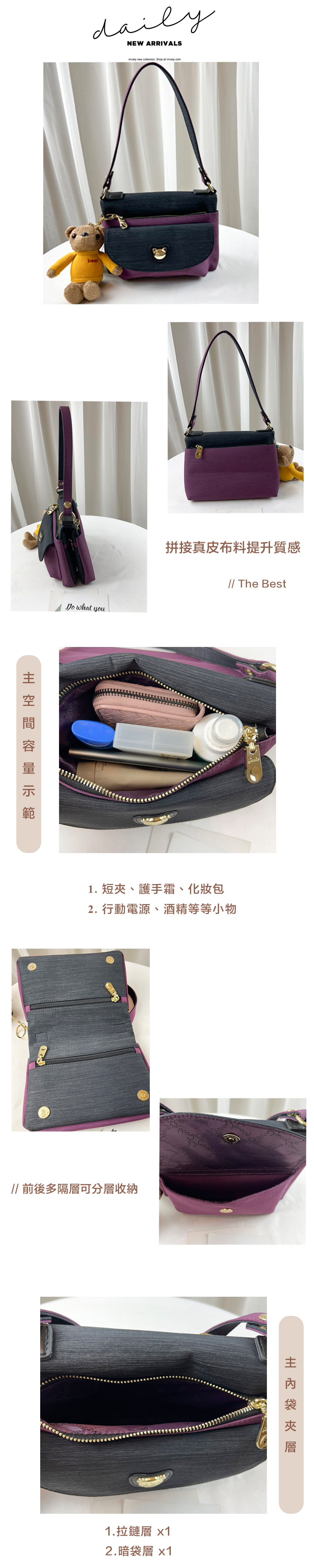 ●  規格:主空間x1  內拉鍊袋x2  前側磁扣x1  後側拉鍊x1