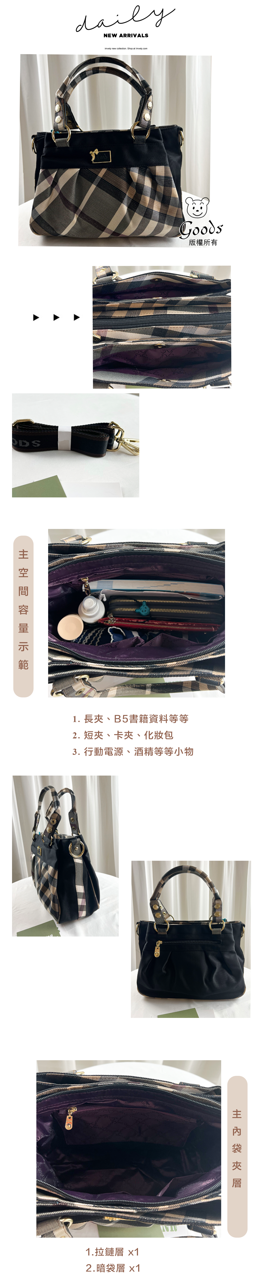 GOODS 金線大格黑拼色手提包 / 側背包 #29537