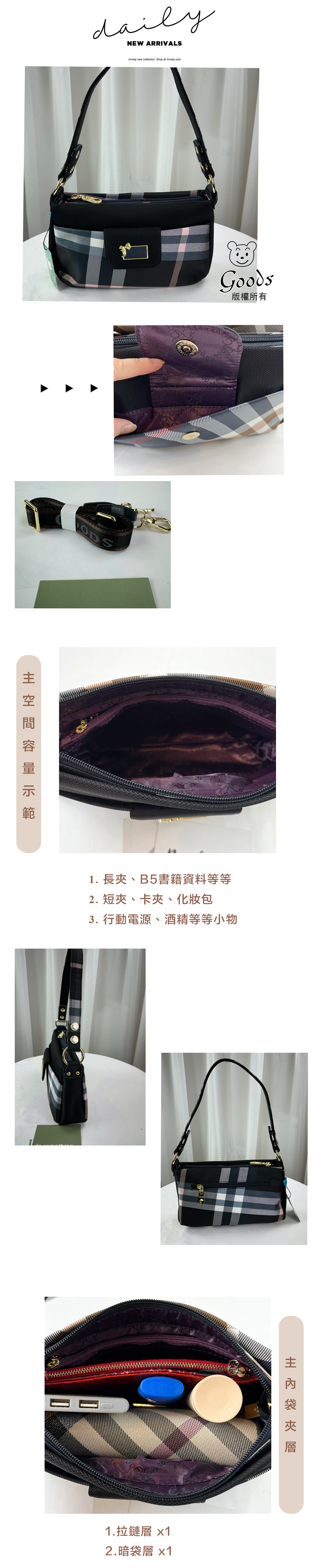 ●  規格:主空間x1  內拉鍊袋x2  暗格x1  前置拉鍊x1  後測拉鍊x1