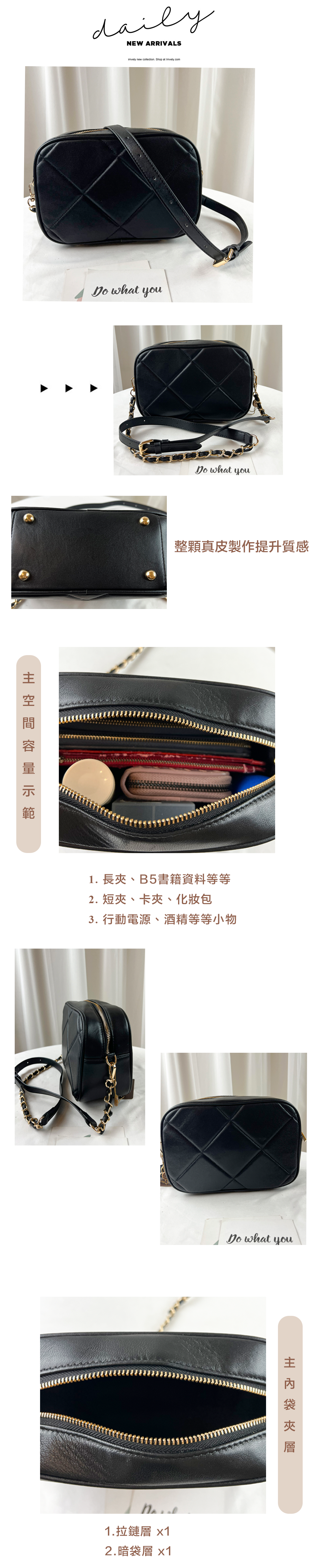 經典黑 菱格真皮牛皮鏈帶肩背包 / 側背包 #SM-6858