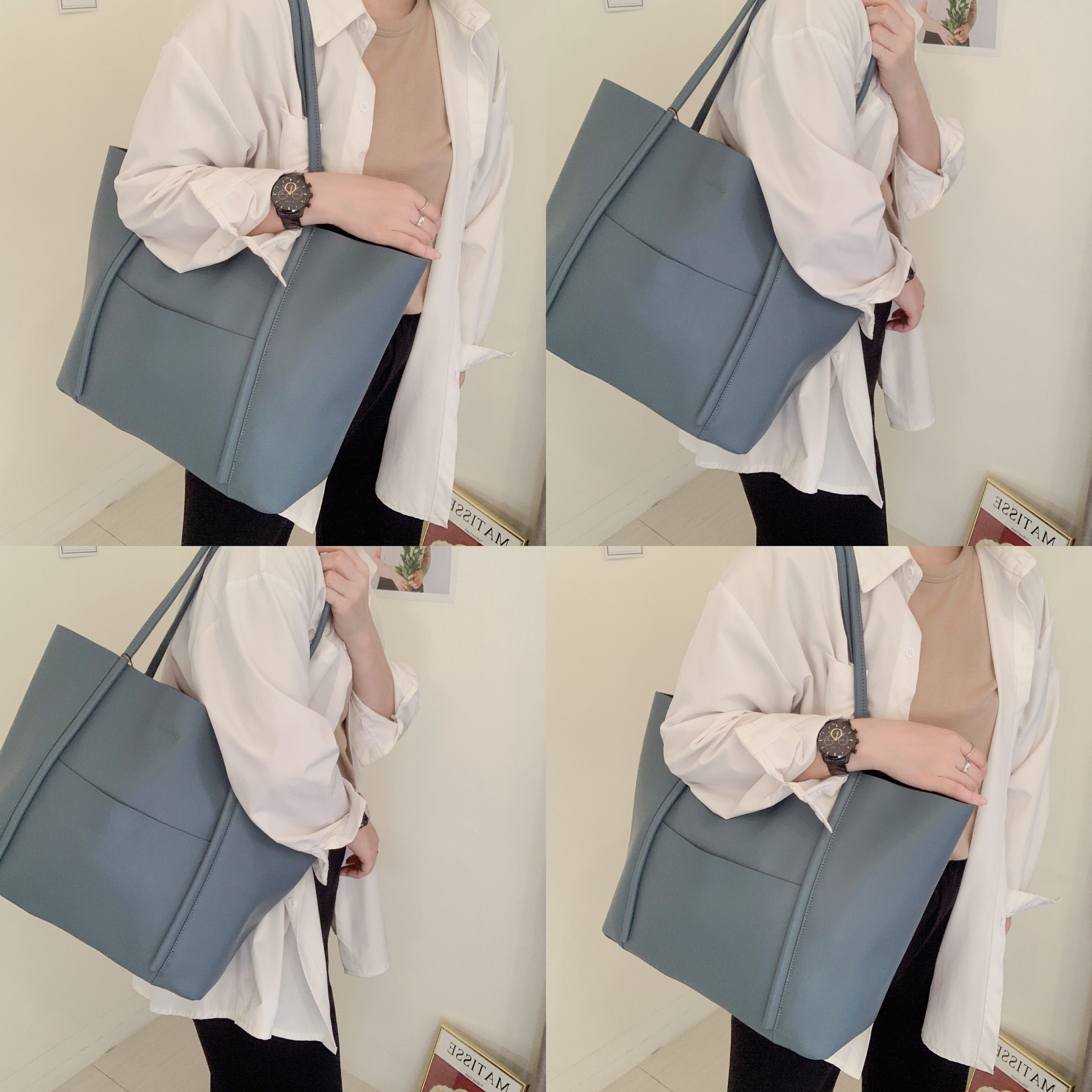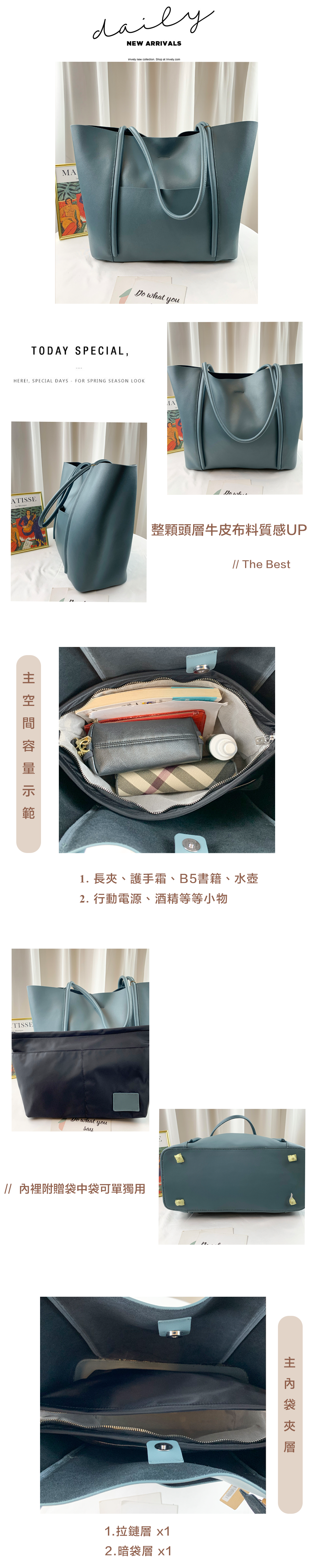 湖水藍 真皮牛皮手提托特包 附袋中袋 #SM-8502