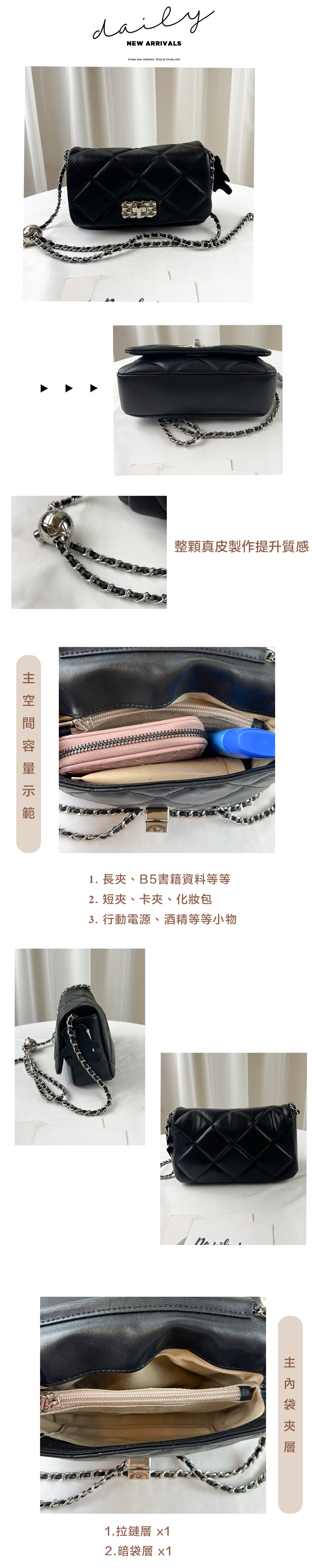 經典黑 菱格銀扣真皮牛皮鏈帶肩背包 / 側背包 #SM-89-6251
